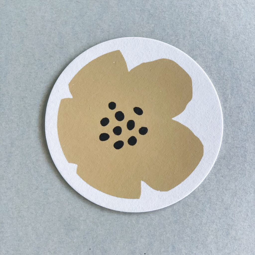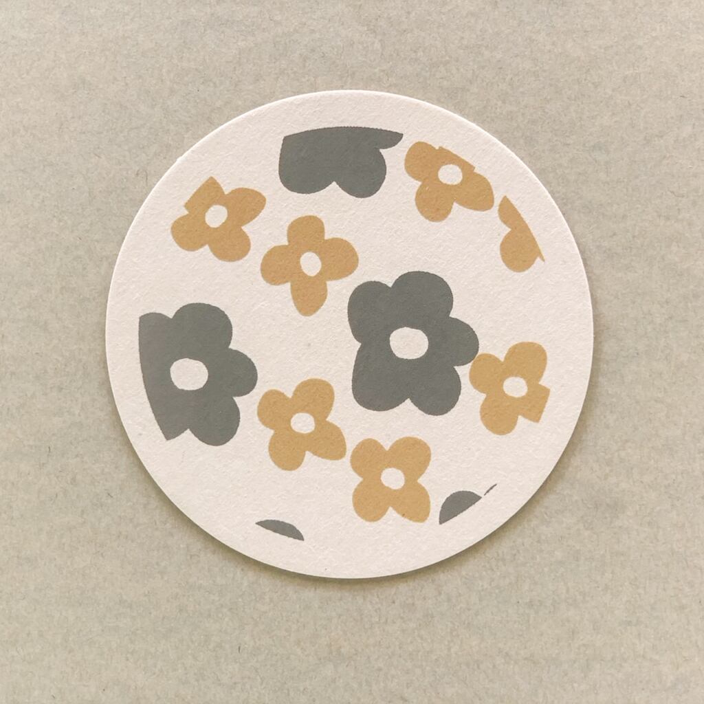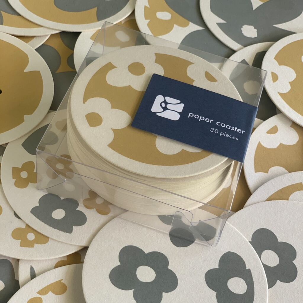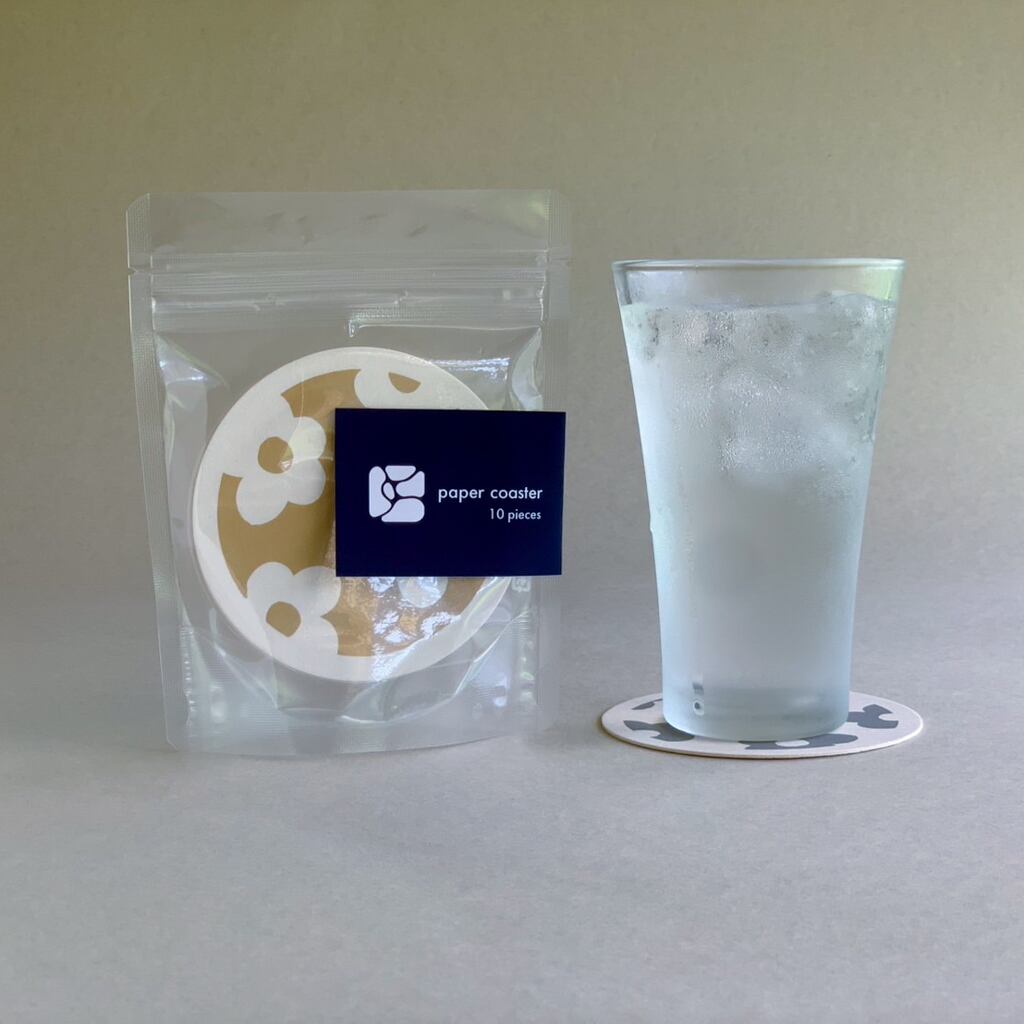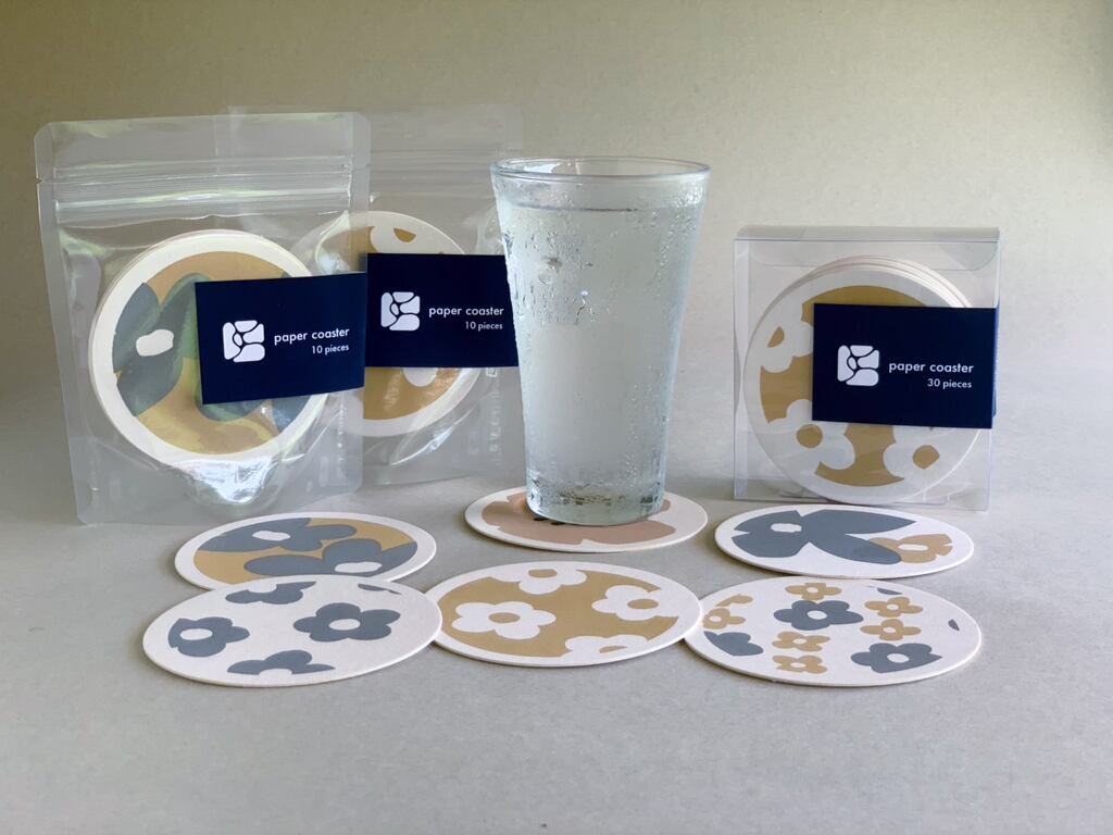 厚さ約1mm 直径9cmの紙コースターのセットになります。
